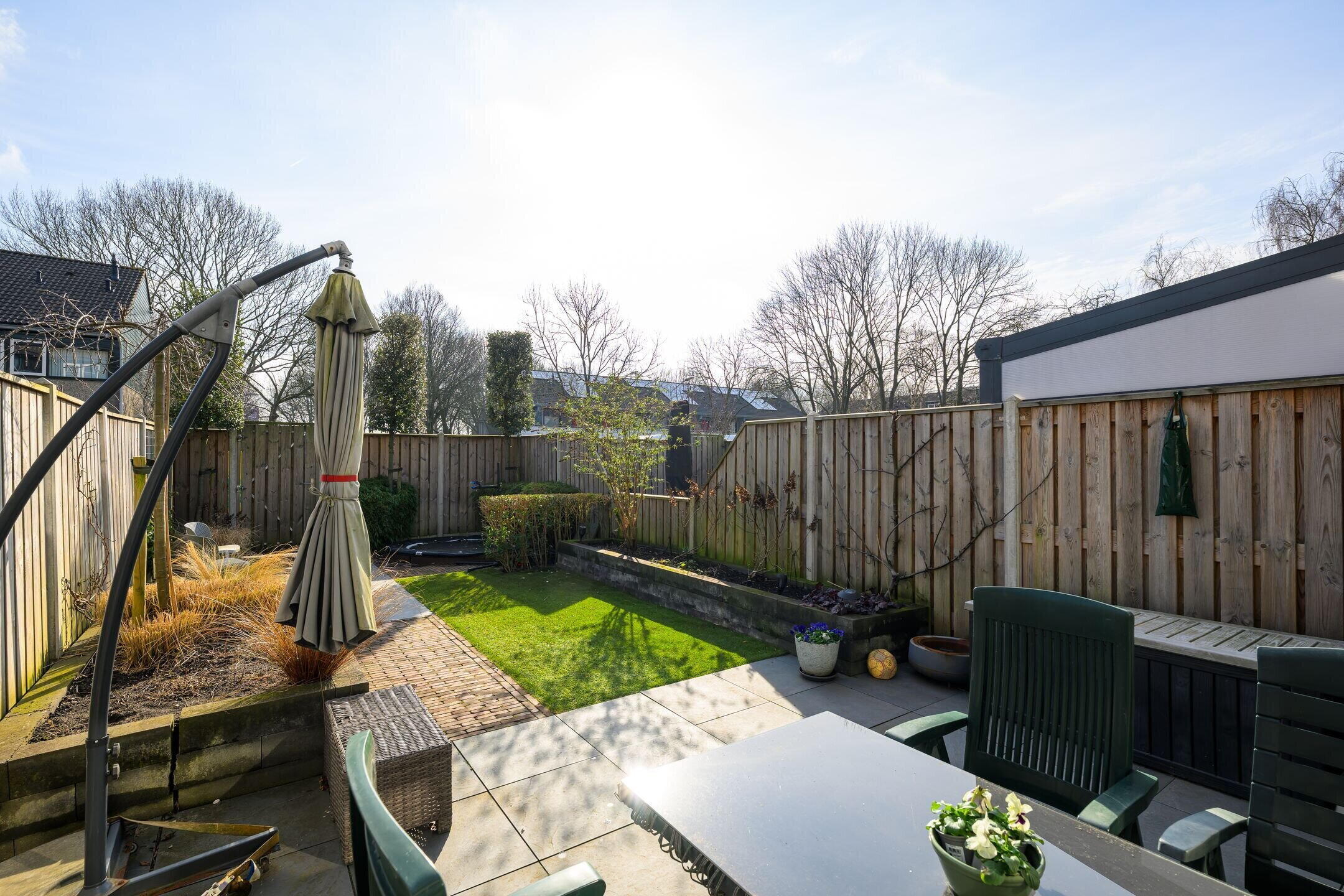 Het elektrische zonnescherm (groen-wit gestreept doek) in de achtertuin (ligging ZO) biedt verkoeling binnen in de zomerperiode en een heerlijke zitplek buiten in de schaduw. De digitale sproeiinstallatie in de voor- en achtertuin zorgt voor de juiste bewatering.
